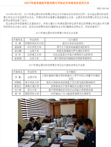 全国光学优秀博士学位论文评选是由中国光学学会组织实施,面向全国光学、光学工程学科及其相关学科领域的博士学位论文评选,每年评选一次。2017年度全国光学优秀博士学位论文评选由国内拥有光学和光学工程及其相关学科博士学位授予权的高等院校和科研院所或中国光学学会会士和理事联名专家推荐,经专家通信评议和全国光学优秀博士学位论文评选委员会会议复评审定,共评选出5篇获奖论文和5篇提名优秀论文。