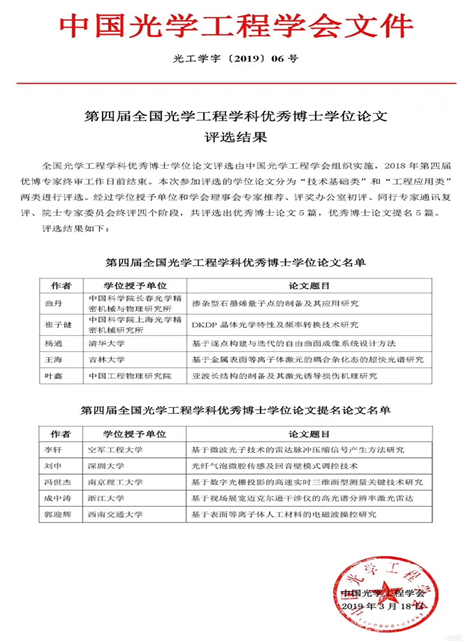 据悉,全国光学工程学科优秀博士学位论文评选活动由中国光学工程学会主办,是自2014年全国取消百篇优博论文评选后光学工程学科最有分量的学科奖项。本次评选经过学位授予单位和学会理事会专家推荐、评选办公室初评、同行专家通讯复评、院士专家委员会终评的四个阶段,共评选出优秀博士论文5篇,优秀博士论文提名5篇。
