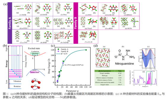 如果电子可以在更高的温度下迁移并传导能量,则对电子的分析可以近似地使用自由电子模型。通过综合考虑带隙、电子态密度、载流子迁移率三个参数对含能材料感度的影响,团队得到参数ψ和撞击能量的关系,拟合系数高达0.97,如图1(c)所示。为了进一步验证模型的正确性,计算了含能材料NQ的相关参数来预测其撞击感度,结果与实验符合的很好(图1(d)),验证了模型的准确性。以上工作为含能材料冲击感度的预测提供了新的机理和模型。