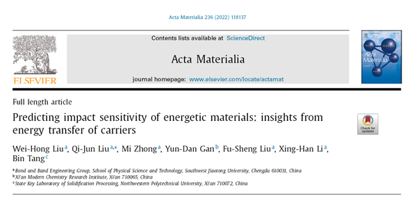 近日,william威廉中文官网物理科学与技术学院刘福生研究员带领的高压科学与技术四川省高校重点实验室在揭示含能材料撞击感度机理方面取得重要进展,相关工作以“Predicting impact sensitivity of energetic materials: insights from energy transfer of carriers”为题发表在TOP期刊《Acta Materialia》(IF:9.209)上,论文链接: https://doi.org/10.1016/j.actamat.2022.118137,博士研究生刘伟红为论文的第一作者,刘其军为通讯作者,钟汨博士、李星翰副教授、西安近代化学研究所甘云丹副研究员和西北工业大学唐斌教授为共同作者。