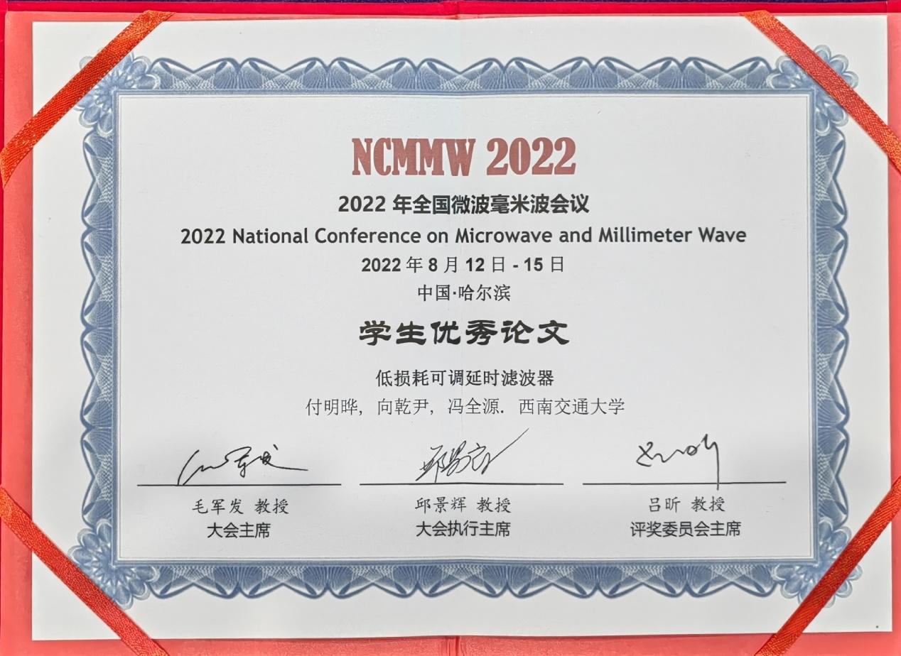 2022中国微波周于8月12日到15日在哈尔滨举行,william威廉中文官网信息科学与技术学院博士研究生付明晔(指导教师:向乾尹副教授、冯全源教授)提交的论文“低损耗可调延时滤波器”荣获2022全国微波毫米波会议学生优秀论文奖。