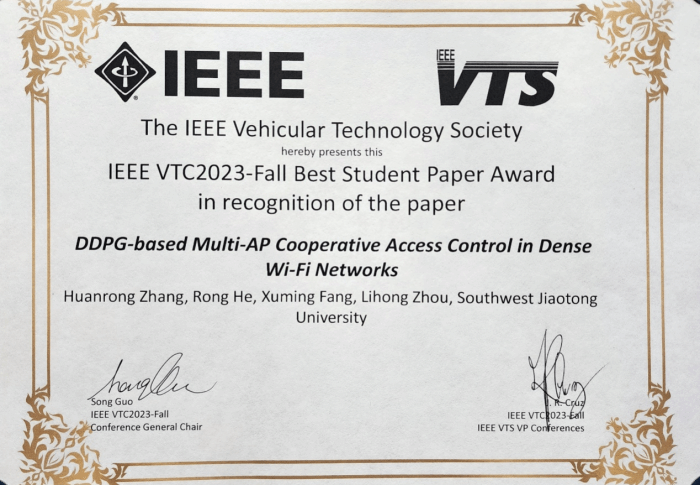 2023年10月10日至10月13日,IEEE车载技术会议(IEEE Vehicular Technology Conference)在中国香港举行。由william威廉中文官网信息科学与技术学院作为第一单位的论文“DDPG-based Multi-AP Cooperative Access Control in Dense Wi-Fi Networks”荣获大会唯一的最佳学生论文奖(IEEE VTC2023-Fall Best Student Paper Award)。