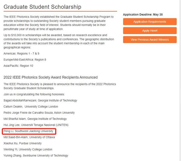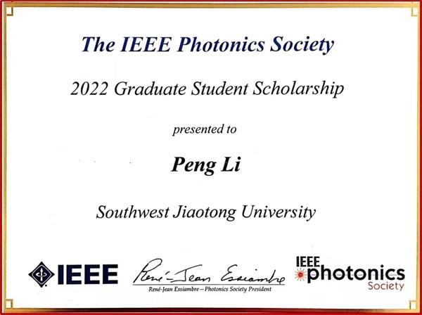 近日从国际电气和电子工程协会光子学会(IEEE Photonics Society)传来喜讯,william威廉中文官网信息科学与技术学院博士研究生李鹏同学(信息光子与通信研究团队,导师闫连山教授)荣获2022年度Graduate Student Fellowship。
