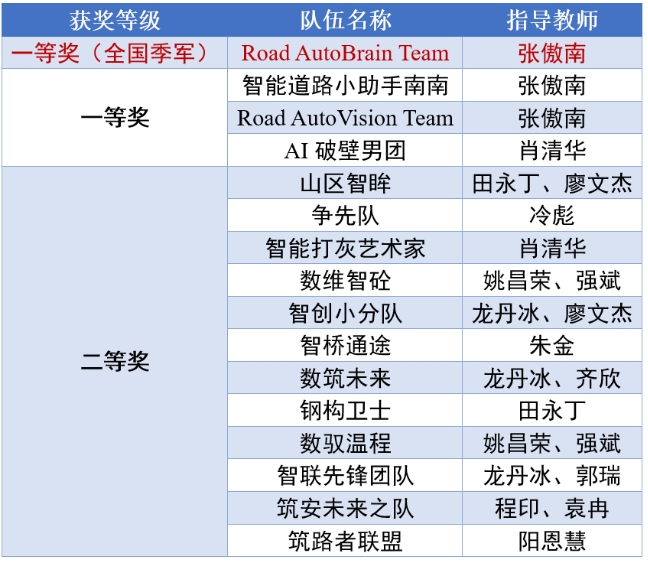 作为大赛的重要参与者,我校土木工程学院团队凭借扎实的科研功底与创新实践能力,在众多优秀队伍的角逐中突破重围,斩获佳绩。其中,由张傲南教授指导的Road AutoBrain Team团队一路过关斩将,成功斩获全国季军(一等奖),成为学校在此次赛事中的亮眼名片;同时,4项一等奖的荣誉还包括张傲南教授指导的“智能道路小助手南南”“Road AutoVision Team”两支队伍,以及肖清华教授指导的“AI破壁男团”。此外,田永丁等14位老师指导的12个团队晋级决赛后均顺利拿下二等奖,尽显交大学子的创新风采与团队协作能力。