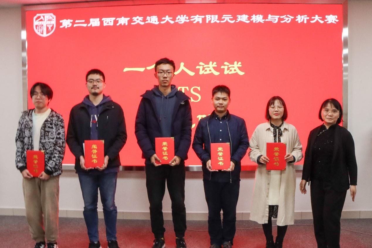 颁奖典礼在三号教学楼30224举行,由力学与航空航天学院副院长阚前华教授主持,研究生院副院长朱志武教授、学院栗民书记以及决赛评委出席了颁奖典礼。朱志武教授代表研究生院致开幕辞,对本次比赛的积极作用予以充分肯定,鼓励相关专业学生深度掌握好有限元分析技术,为国家重大工程实践做出重要贡献;随后,阚前华教授对比赛详情进行了介绍,分析了本次大赛的经验与不足。在颁奖环节中,栗民书记为获特等奖团队颁发了荣誉证书和奖金,朱志武教授为获一等奖颁发了荣誉证书和奖品,师明星教授为二等奖颁发了荣誉证书和奖品,张娟系主任为获三等奖团队颁发了荣誉证书和奖品,成都玛尔斯科仿真科技有限公司总经理李相辉为最受关注奖颁发了荣誉证书和奖品。最后由学院栗民书记致闭幕辞,栗民书记表示学院非常感谢研究生院的大力支持,学院也将积极支持该大赛的持续举办,鼓励大家不断夯实有限元基础,学以致用,希望同学们来年再战,取得更好成绩。