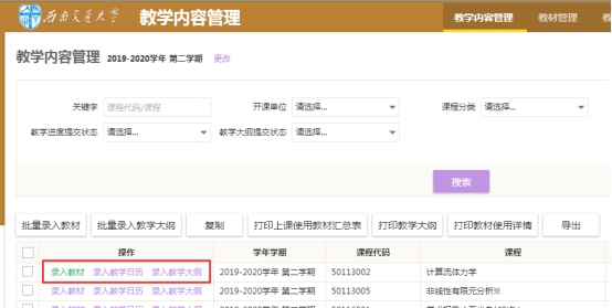 2.依次点击“录入教材”“录入教学日历”和“录入教学大纲”,录入课程资料信息。