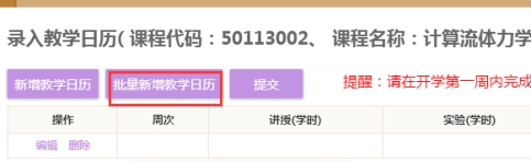 (2)录入教学日历:建议用“批量新增教学日历”功能,录入后,须点击保存,再点击“提交”完成教学日历录入。