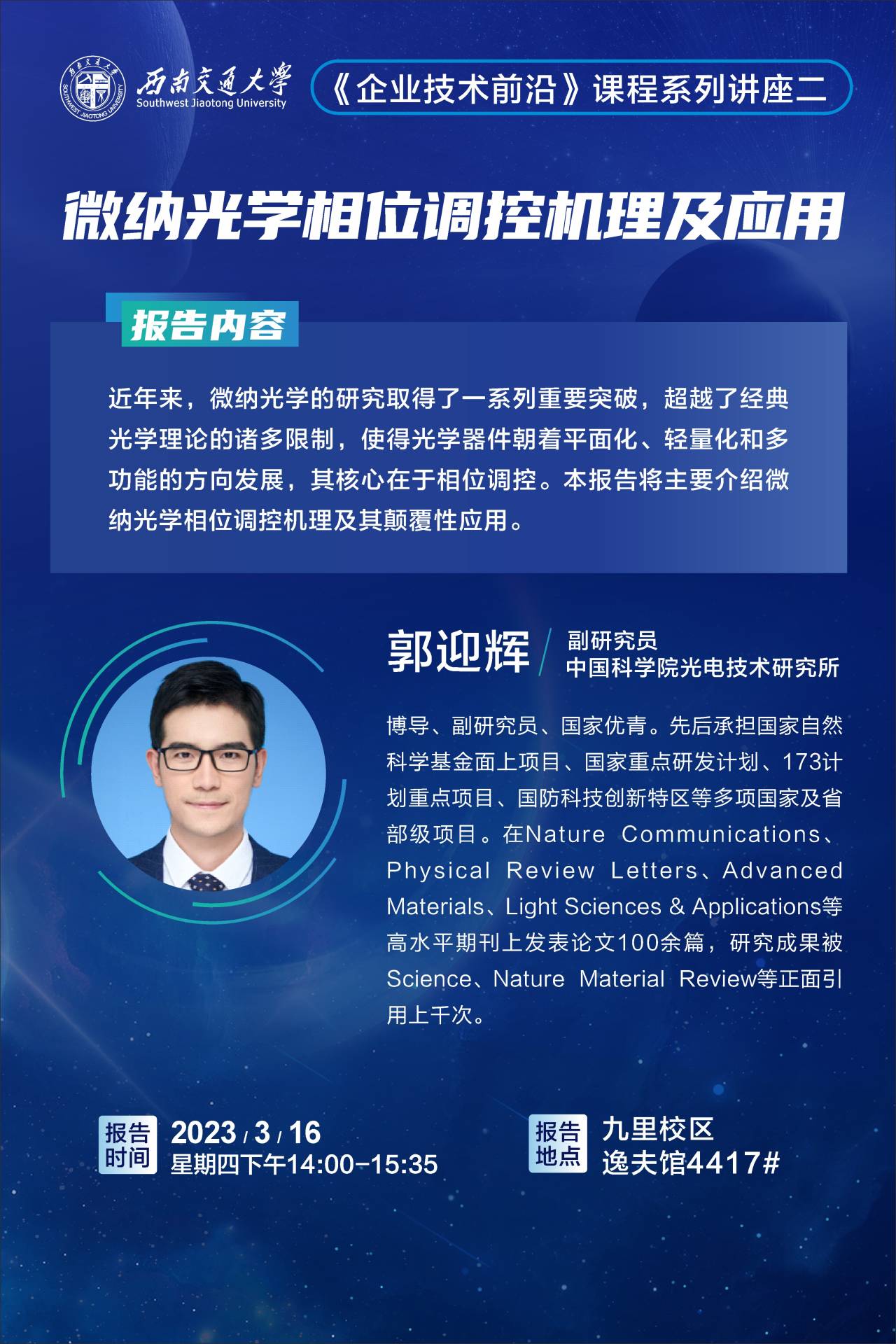 第二期课程安排在2023年3月16日(周四)下午第一讲(14:00-15:35)九里校区4417教室进行,请电气工程学院、信息科学与技术学院、计算机与人工智能学院2022级人才专项学生准时到课,同时欢迎其他有兴趣的同学到场听课。